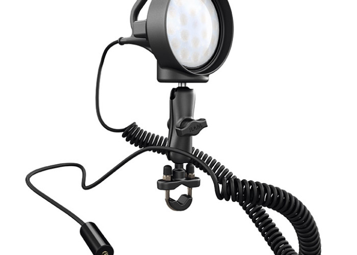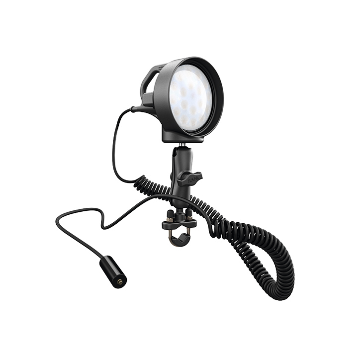 - 540 lumens LED light (9 Watt) heavy-duty spotlight standard-equipped with 1” (2.5 cm) diameter rubber-coated double ball and socket system.