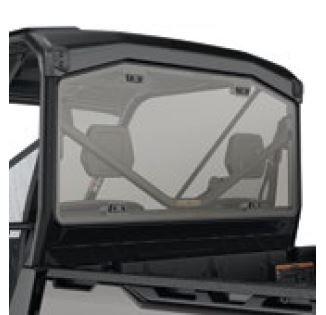 Rear polycarbonate window blocks windshield back draft or dust and rain from entering for added cabin comfort