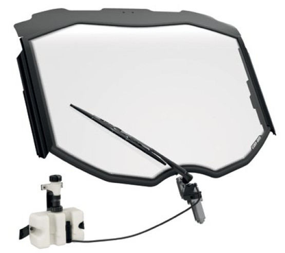 - Complete kit that includes the curved and laminated glass windshield with the single speed wiper and washer fluid dispenser.